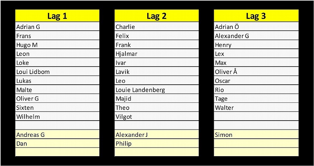 Här kommer lagindelningen till söndagens match mot SSK lag gul. Vi spelar i gul/svarta tröjor.