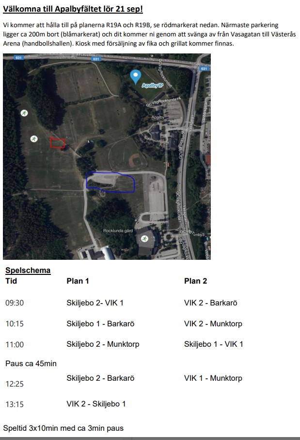 Lördag 21/9 är två av våra lag inbjudna till Poolspel på Apalby/Rocklunda. Det är Västerås IK som anordnar. Lagen samlas 30min innan första match vid respektive plan, matchredo. I matcherna mot VIK, och kanske även mot Munktorp, spelar vi i vita tröjor.